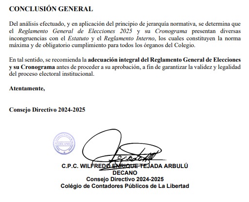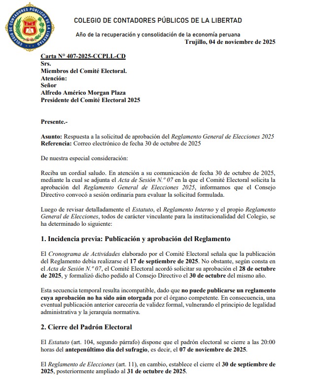 El conflicto surgió luego de que el Comité Electoral enviara el Acta de Sesión N.º 07 al Consejo Directivo el pasado 30 de octubre, solicitando la aprobación del Reglamento General de Elecciones 2025. Sin embargo, mediante la Carta N.º 407-2025-CCPLL-CD, la directiva de Tejada observó el documento, alegando supuestas incongruencias entre el reglamento, el cronograma electoral y el Estatuto del gremio.