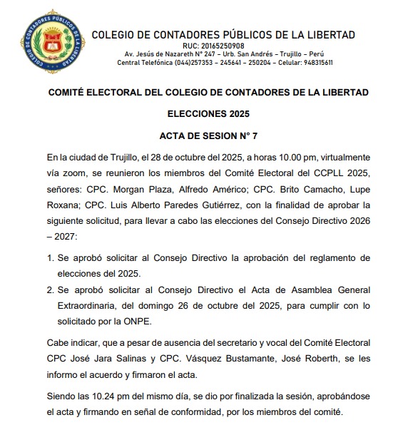 El proceso electoral en el Colegio de Contadores Públicos de La Libertad (CCP-LL) se encuentra en medio de una fuerte controversia. Agremiados acusan al actual decano, Wilfredo Tejada Arbulú, de poner trabas al desarrollo de las elecciones para elegir al nuevo consejo directivo para el periodo 2026-2027, programadas para el domingo 9 de noviembre.