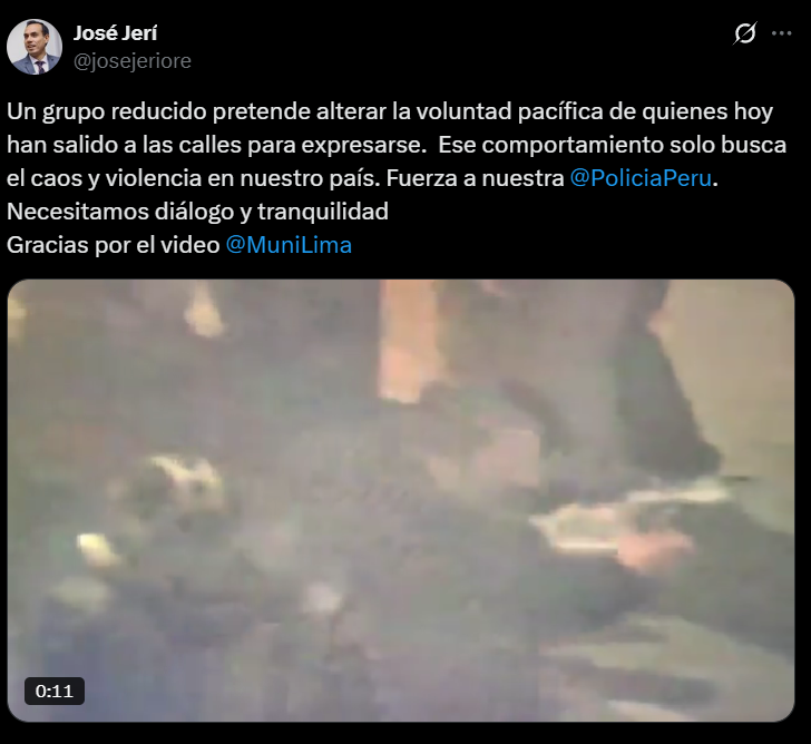Horas antes, Jerí ya había manifestado su postura frente a las protestas ocurridas en la avenida Abancay, señalando que la protesta es un derecho, pero no se permitirá que se use la violencia como medio de expresión.