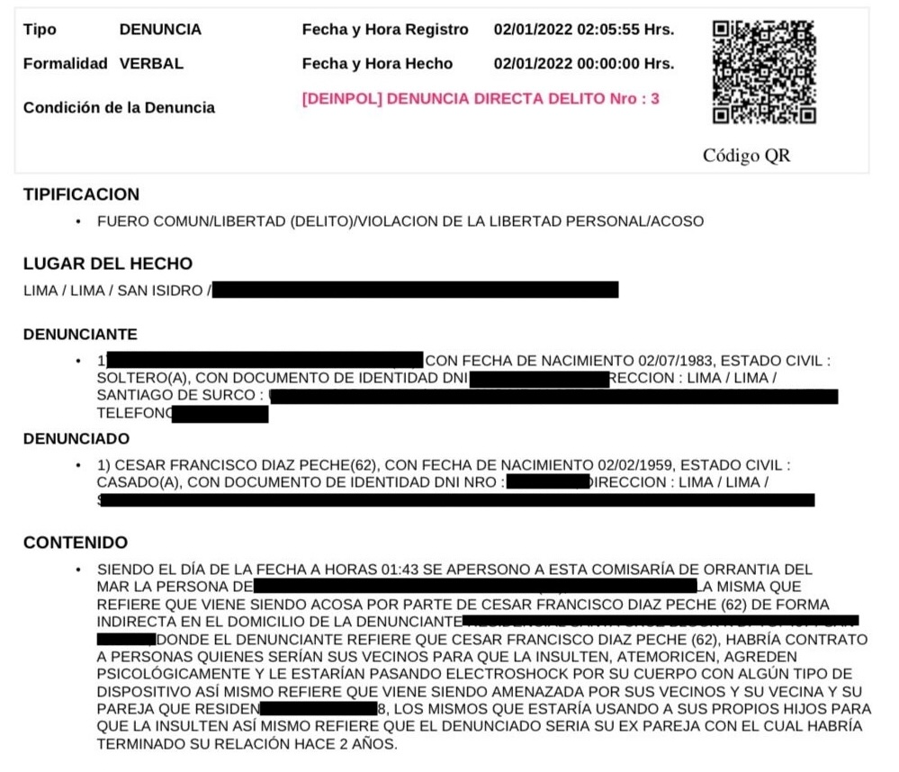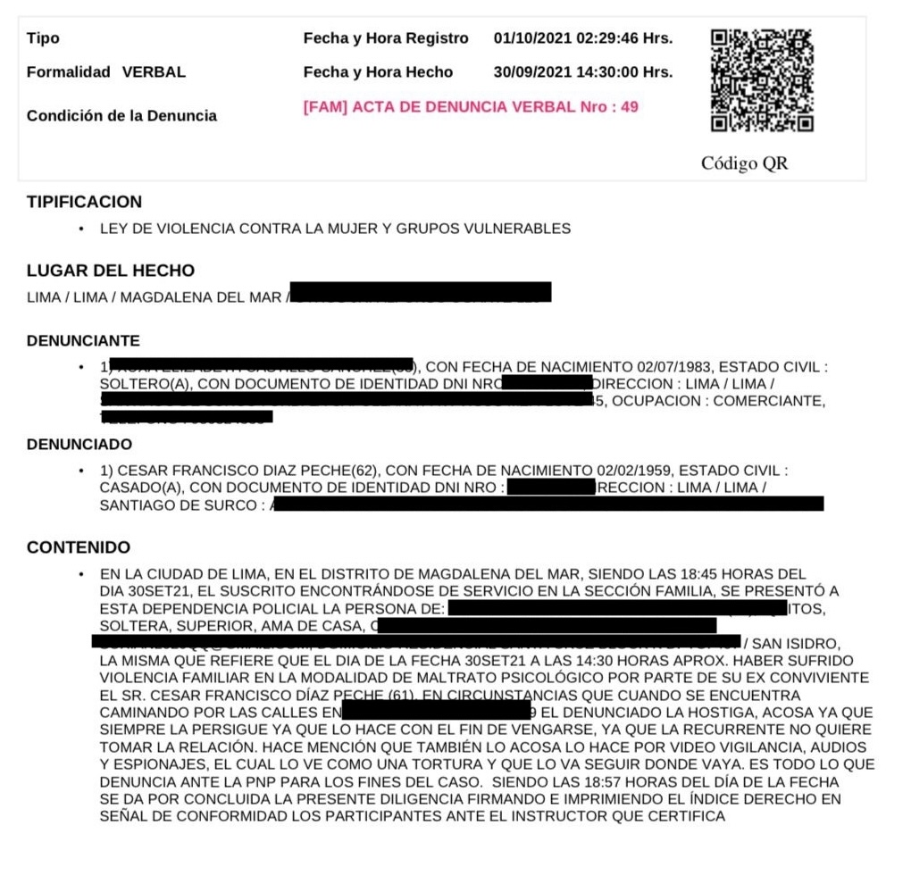 Según el acta policial, la mujer denunció que el hoy ministro “siempre la persigue, con el fin de vengarse”, señalando que Díaz Peche habría continuado vigilándola incluso después del fin de su relación.