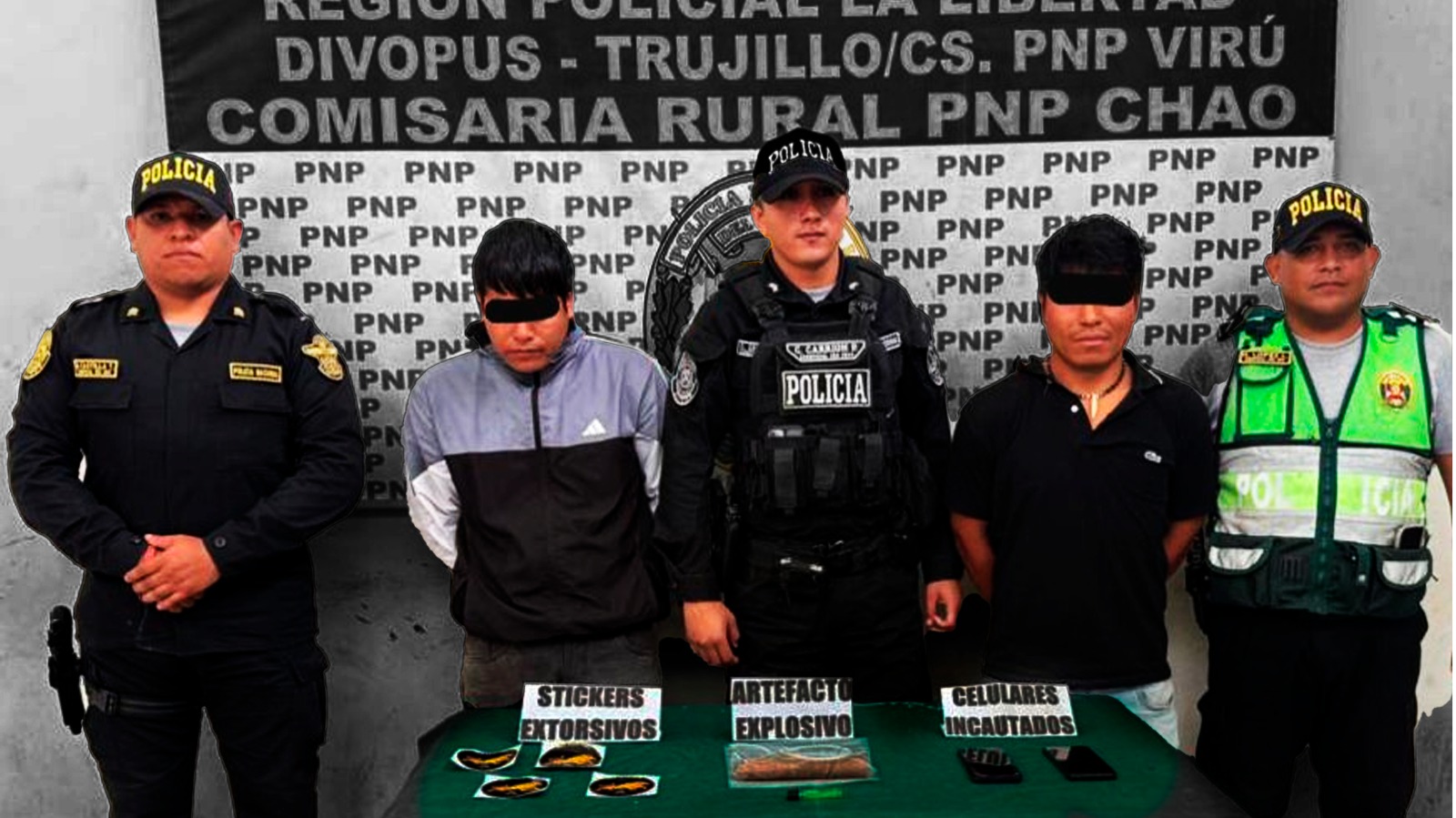 En un operativo realizado por la Comisaría Rural PNP Chao, capturaron a la banda criminal “Los Faites de Buenavista”, la cual era integrada por Josue Michael Castillo Gamarra (25) y Ernesto Anderson Cavero Gamarra (33), quienes fueron sorprendidos en flagrancia portando artefacto explosivos y material extorsivo en plena vía pública.